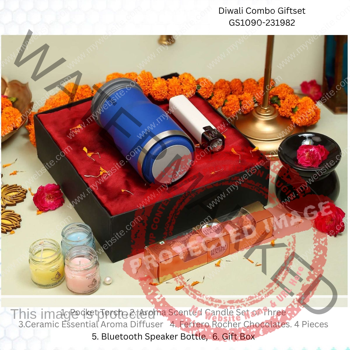 Our gift hampers include Ferrero Rosher chocolate set of 4 pieces. pocket torch, sipper bottle with speakers, Ceramic Aroma Diffuser, aroma candles set of 3.