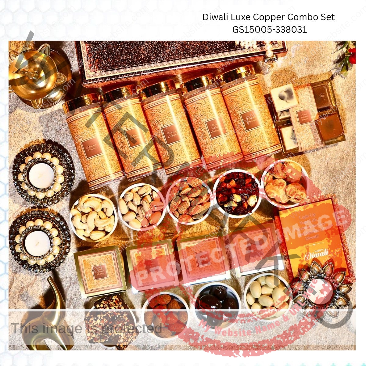 Our gift hampers include Metal Diya 2 pcs, Tea Light Candle 3 pcs, Choco Almond Date Balls 50 grams, Tiramisu Choco Biscofs 50 grams, Blueberry Cheese cake 50 grams, Choco Almond Brittles,50 grams, Premium Almond Jar 100 grams, Premium Cashew Jar 100 grams, Premium Pista chio Jar, Premium appricot jar 100 grams, Premium masala brries Mix jar 100 grmas, Premium assorted Chocoloates set of 4pcs 80 grams, Diwali Greeting Card.